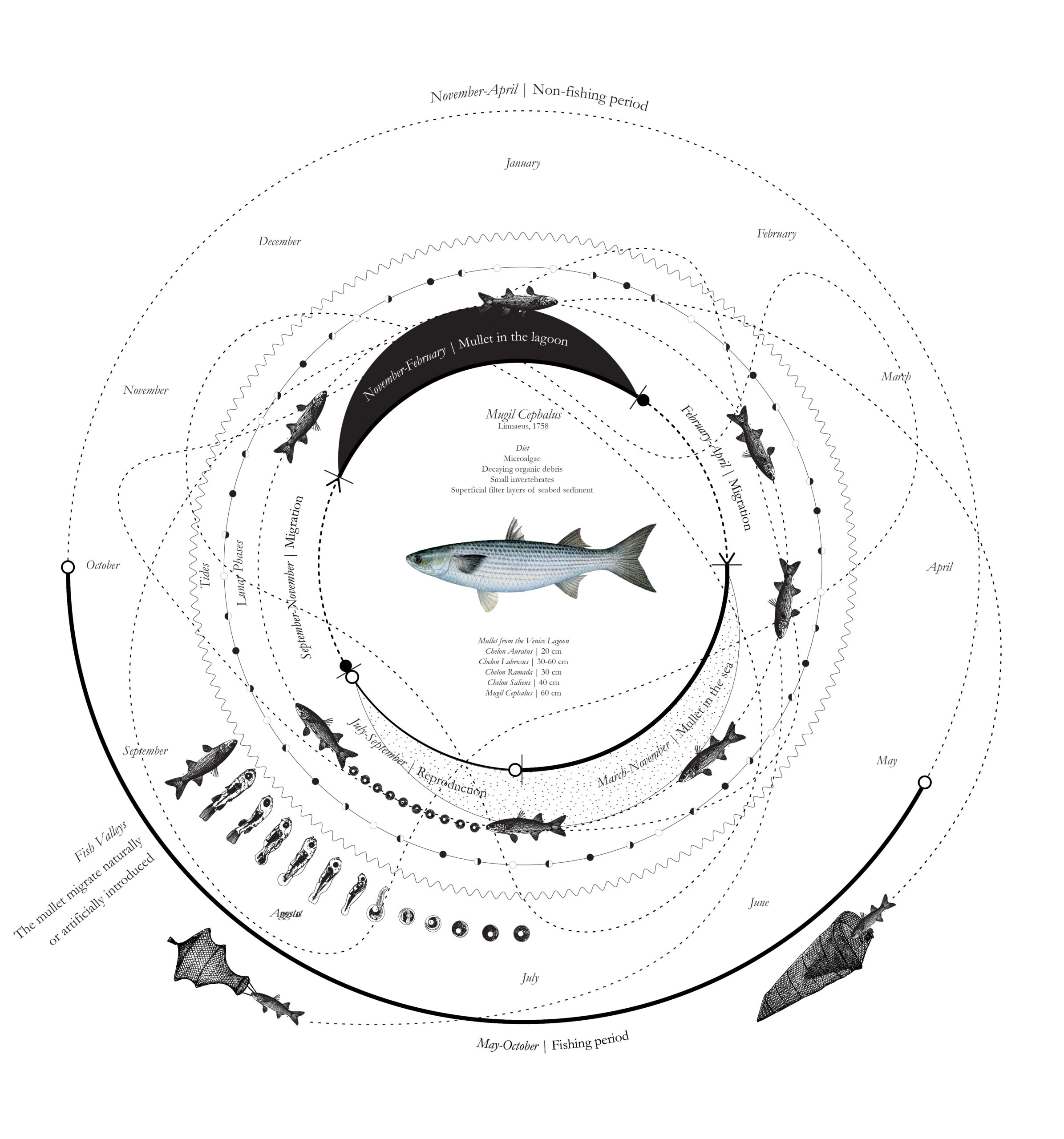 The top image depicts the cycle of grey mullets in the Adriatic Sea and the Venice Lagoon.